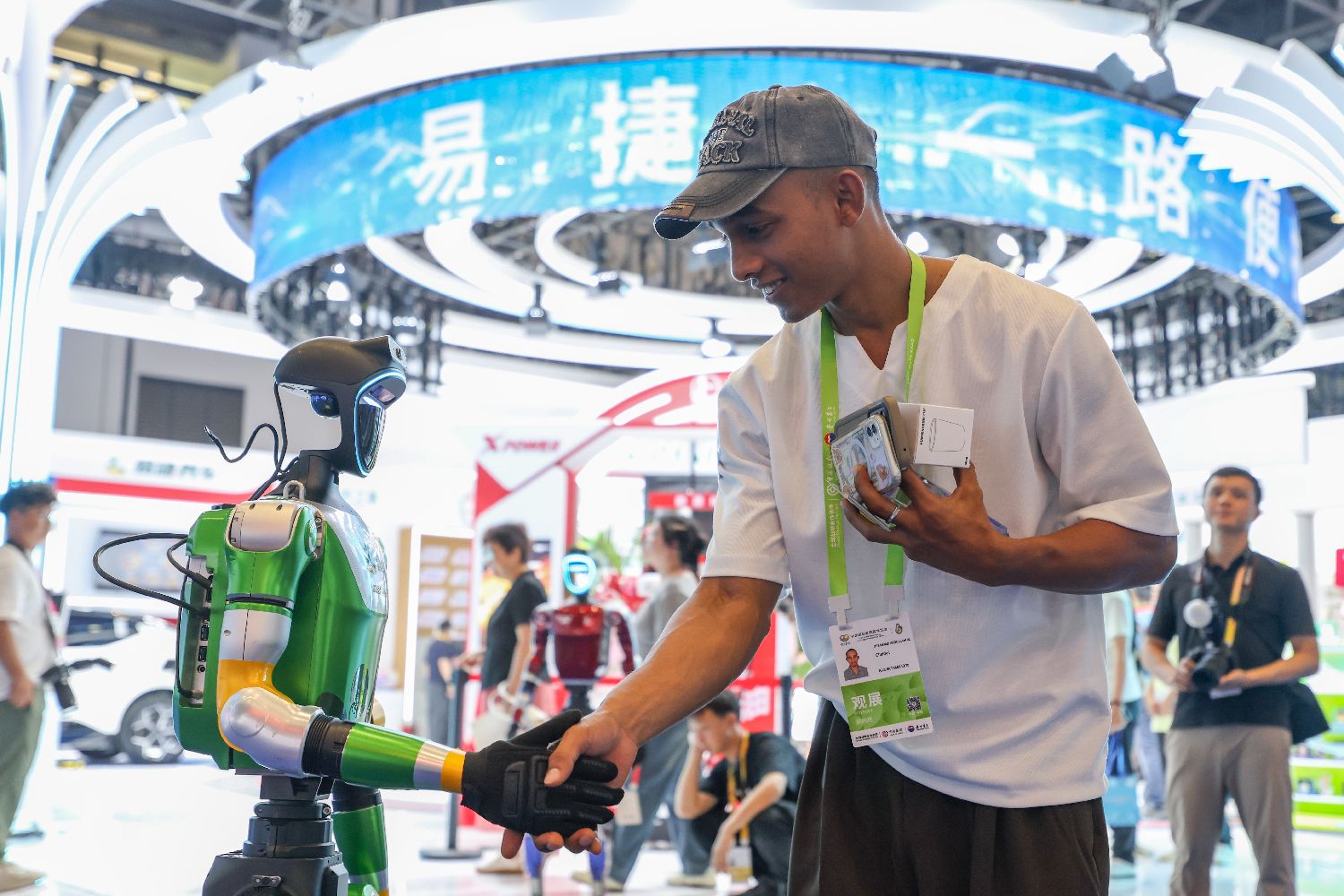 ▲4月14日,第六届中国国际消费品博览会正在海南海口举办。图为来自孟加拉国的参观者和机器人握手。(图片来自中新社)