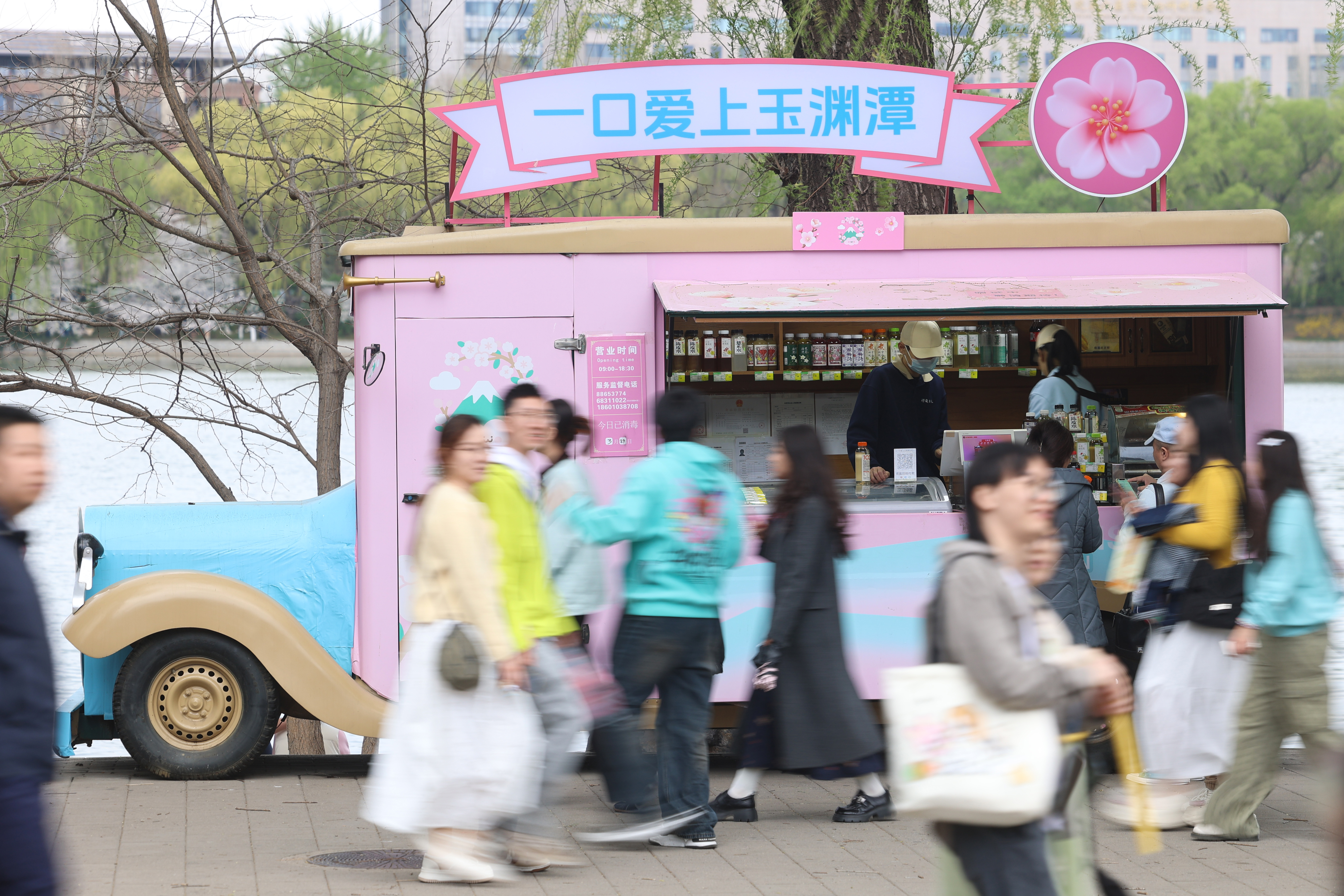 3月29日,公园内樱花季限定甜品和新派茶饮吸引游客前来品尝。李国庆摄