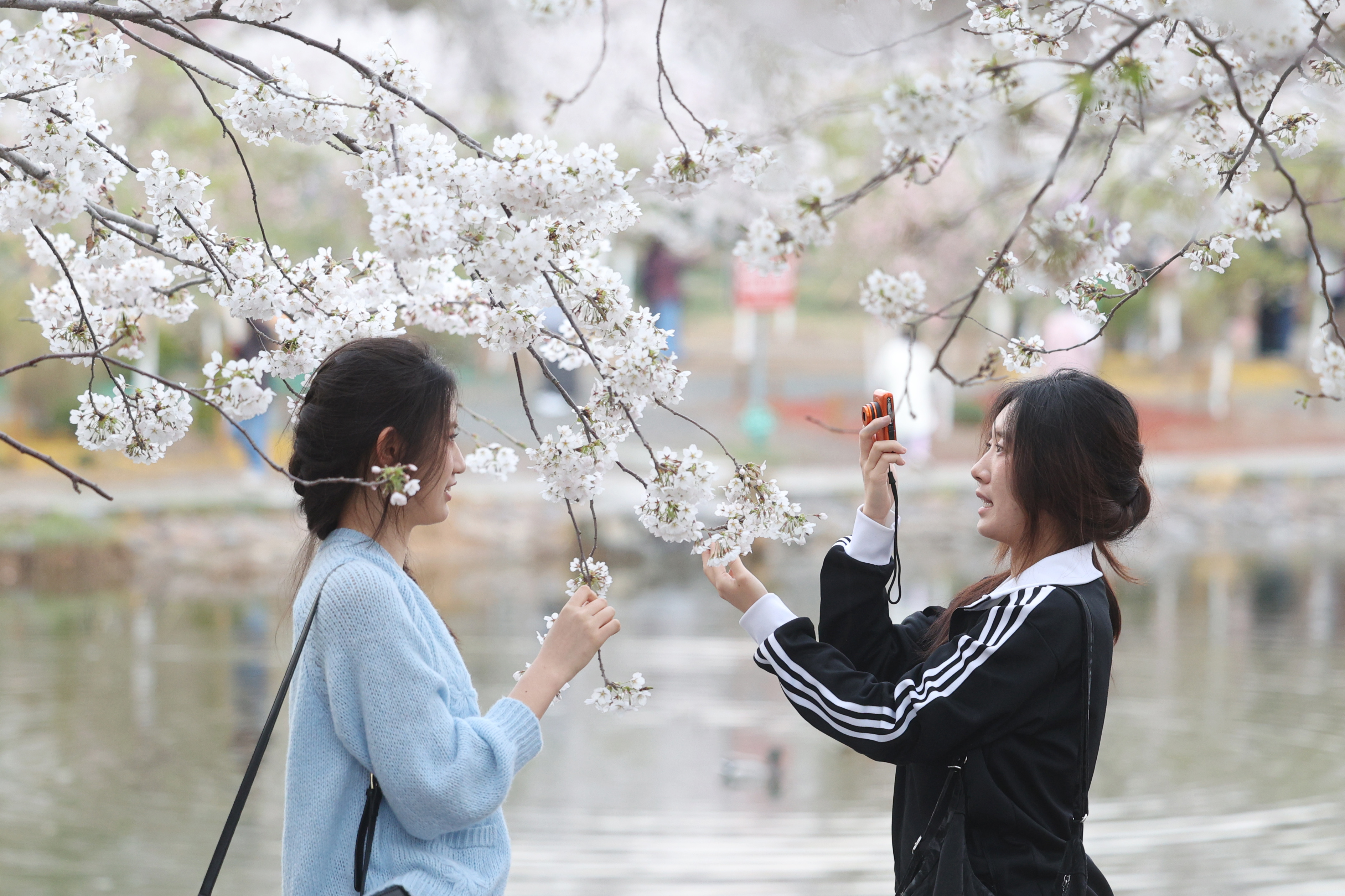 3月29日,游客在樱花前摆姿势拍写真。李国庆摄