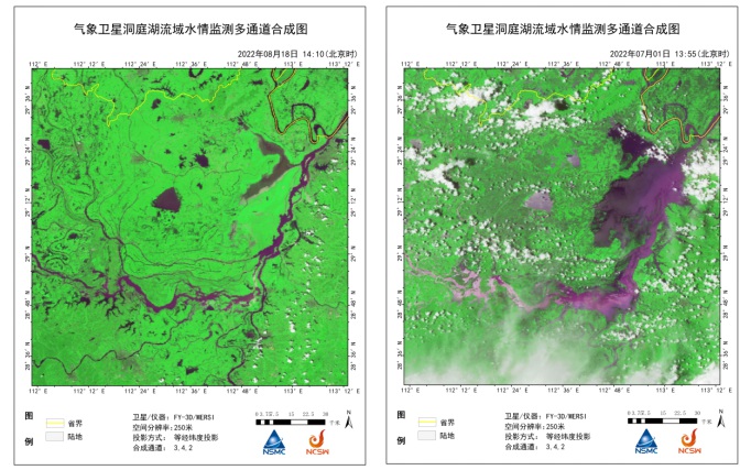 位于湖南省境内的洞庭湖水体面积也较往年同期出现了大幅缩减,据FY-3D气象卫星监测显示,洞庭湖水体面积8月18日(左图)水体面积约为548平方公里,较2022年7月1日(右图)水体面积减少约66%。