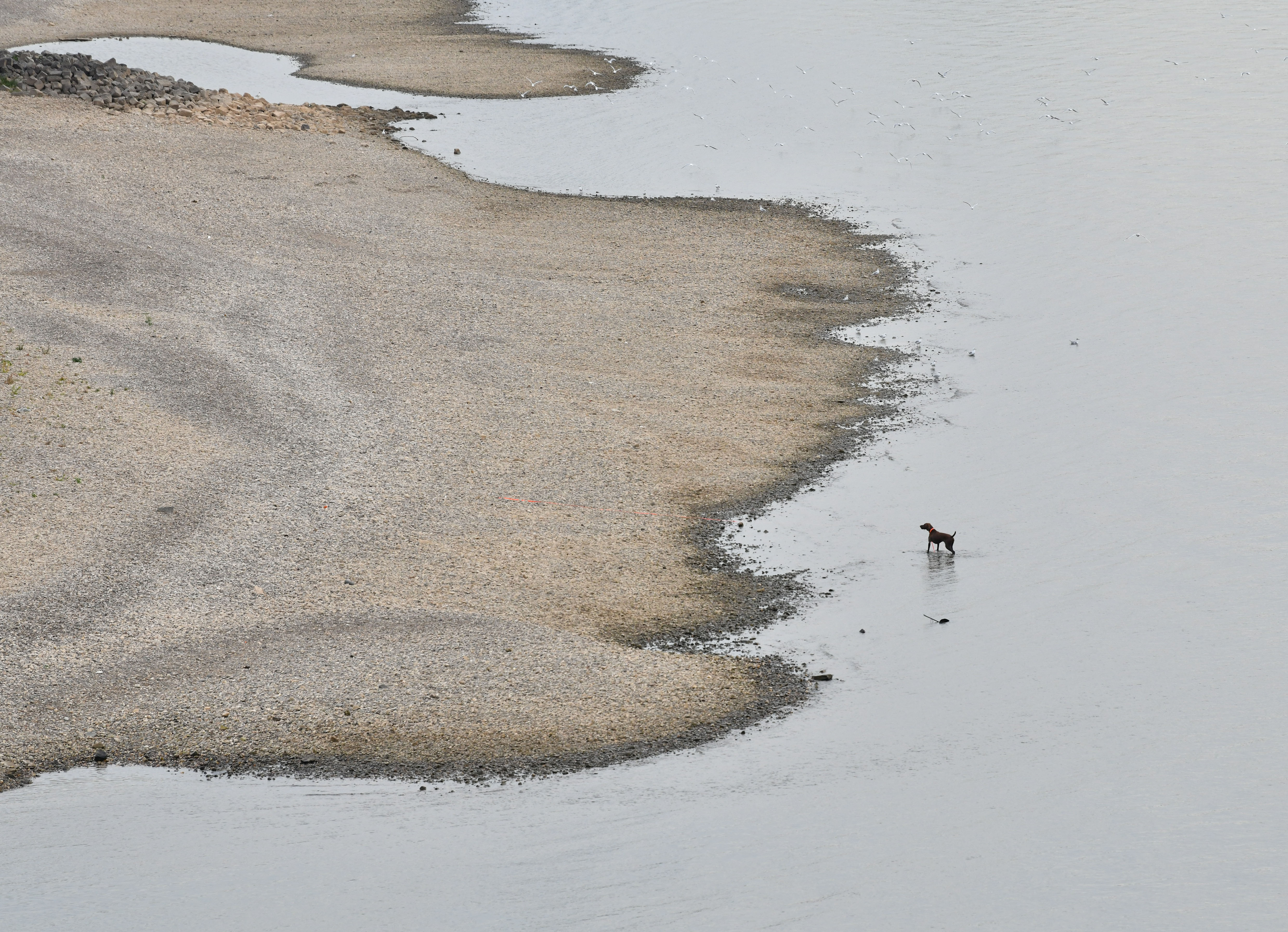 ▲莱茵河水位下降,一只小狗在莱茵河畔玩耍。(图片来自新华社)