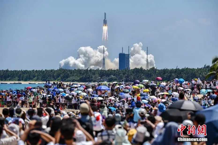 ▲民众在海南文昌淇水湾沙滩观看长征五号B遥三运载火箭点火升空。(图片来自中新社 骆云飞摄)