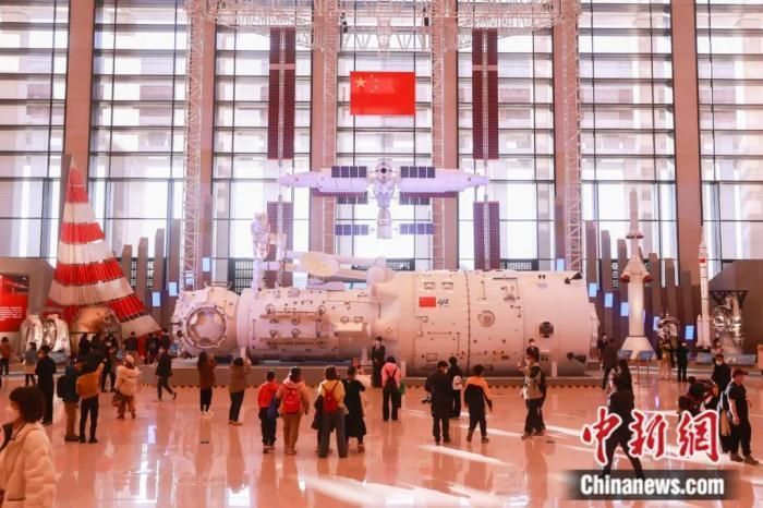 ▲2023年2月,观众在中国国家博物馆举行的中国载人航天工程三十年成就展上观看中国空间站天和核心舱、空间站组合体模型。陈晓根 摄