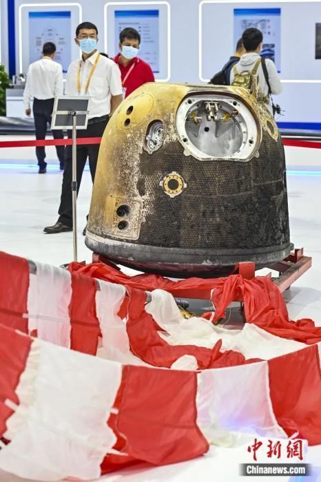▲2021年9月,广东省珠海市,观众在第十三届中国航展上观看嫦娥五号返回舱、降落伞实物。陈骥旻 摄