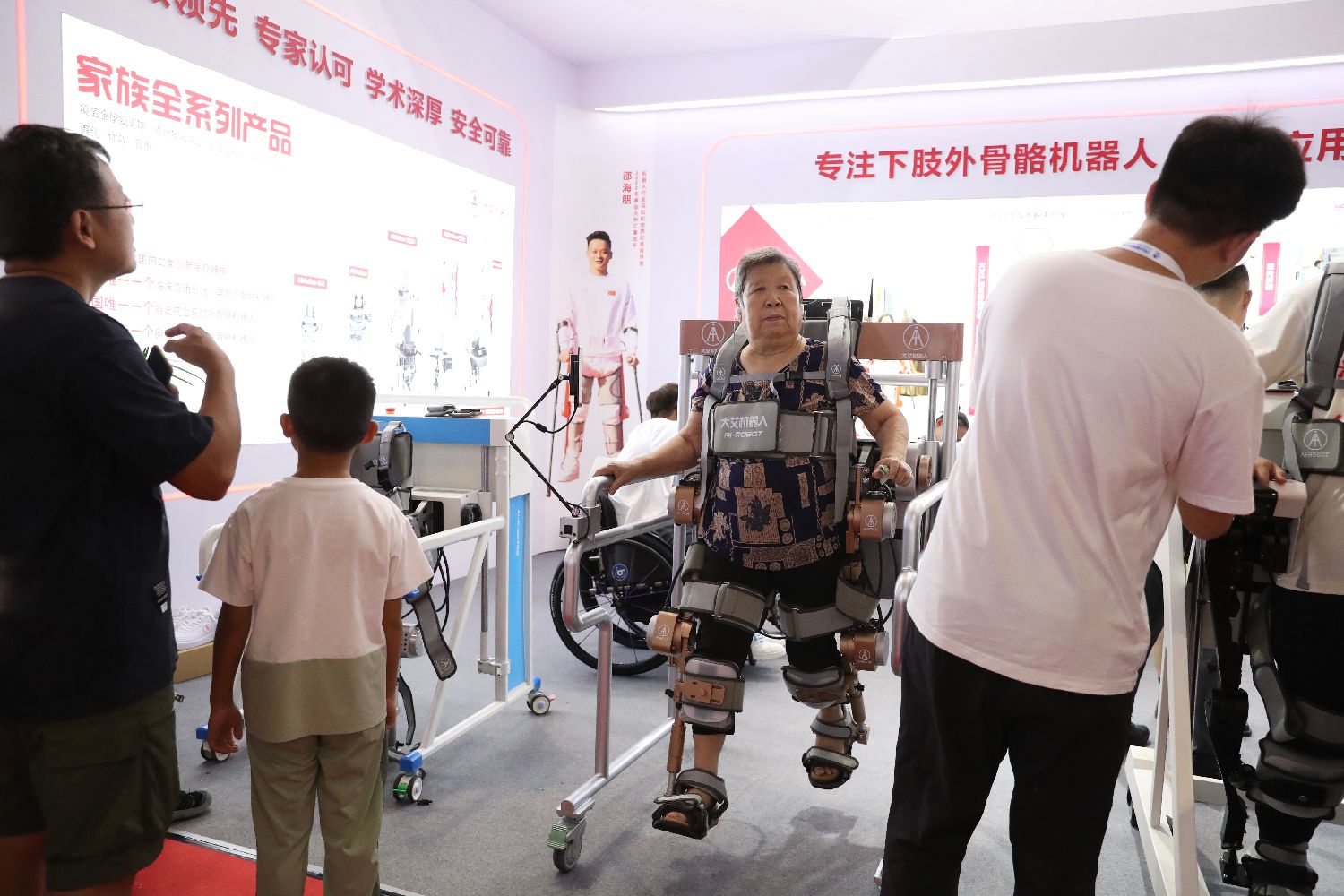 ▲观众体验下肢外骨骼机器人。(图片来自中新社)