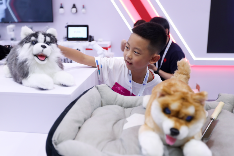 ▲儿童观众与仿真宠物机器人互动。(图片来自中新社)