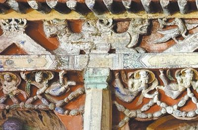 当我们走进建于公元5世纪的云冈石窟第12窟前室,可以在西壁中部看到一座雕刻繁复精美的佛殿。佛殿的柱头斗拱轮廓貌似传统的“一斗三升”(一个栌斗承托一个横拱,其上承接三个小斗组成的斗拱结构),这其实是两只身体相连的怪兽,它们昂首张嘴、前爪趴伏,身体相连处装饰獠牙横生的兽面(见图一)。