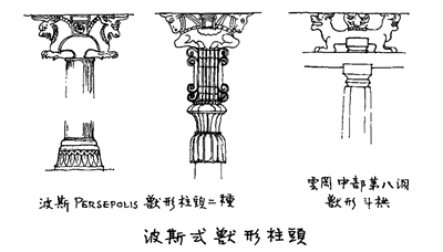 这样的柱头形制和装饰元素在我国当时及之前的建筑中并未发现,其源头可以追溯至遥远的古波斯地区。这是当地最富特征的装饰题材和手法之一,在阿契美尼德王朝(即“波斯第一帝国”)的都城——波斯波利斯遗址上,至今矗立着顶部装饰着双牛、双狮、双马或双神鸟的高大石柱。