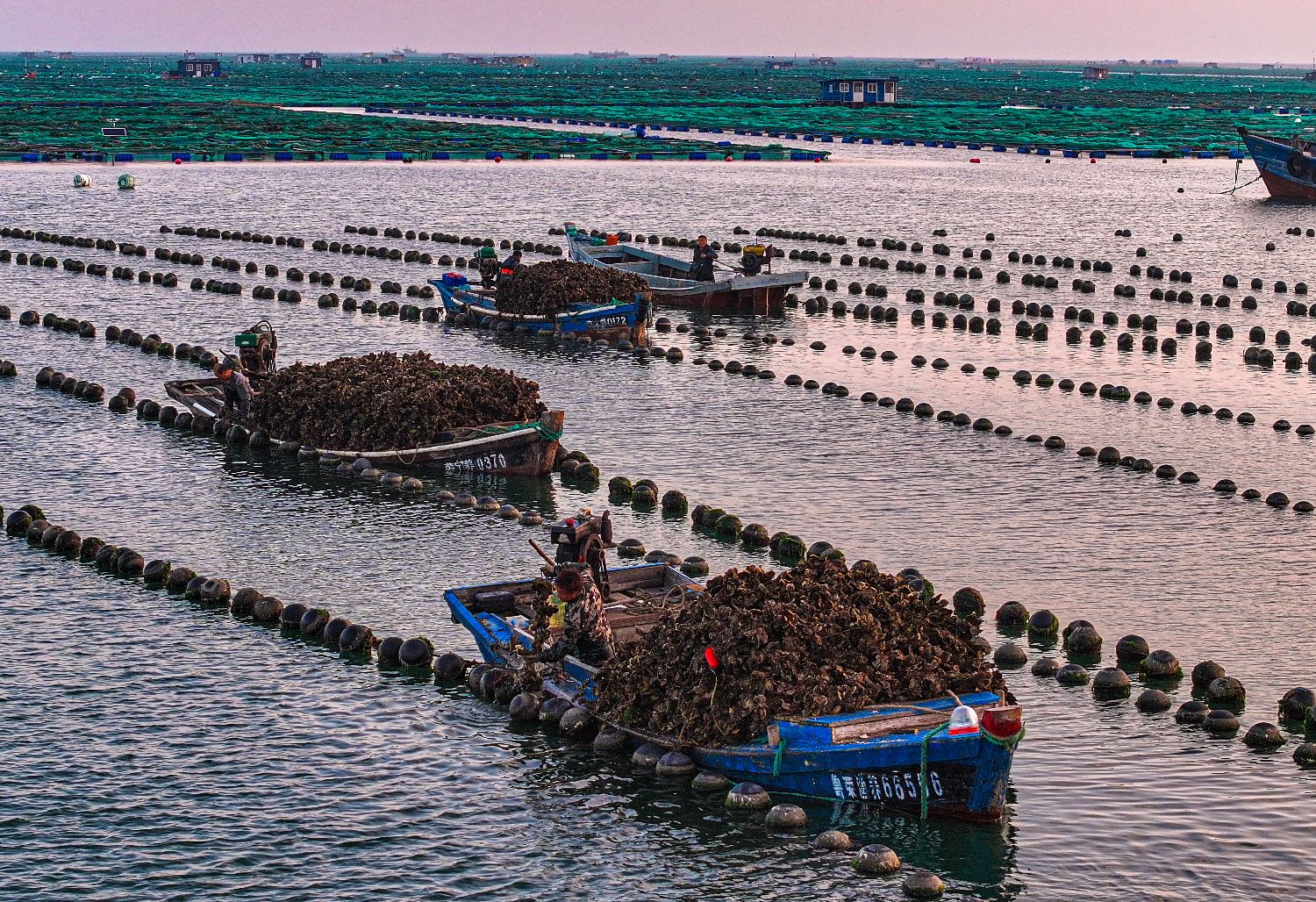 ▲2024年11月2日,山东荣成桑沟湾海域,渔民驾驶渔船收获牡蛎。近年来,当地推广"浅海多营养层次生态养殖模式",产出的牡蛎、扇贝、海参等海产品备受市场青睐。(无人机照片)(图片来自中新社)