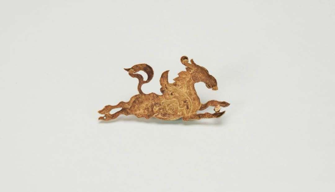 这匹小巧的金马仅长6.4厘米、宽3.2厘米、厚约3毫米,却凝聚着令人惊叹的匠艺与匠心。它被定格于腾空跃起、仰天嘶鸣的瞬间:鬃毛飞扬,肌肉线条遒劲有力。最引人注目的是,工匠为其前肢插上了飞扬的翅膀,尽显凌空翱翔之姿,赋予其超凡的神性。