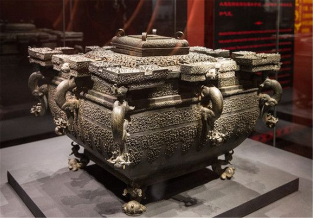 和曾侯乙铜鉴缶原理相同的,还有出土于湖北随州市文峰塔墓地的错金云纹铜鉴缶。该器物同样藏于湖北省博物馆,器身满饰错金三角勾连云纹并镶嵌绿松石,可谓颜值与实力兼具。
