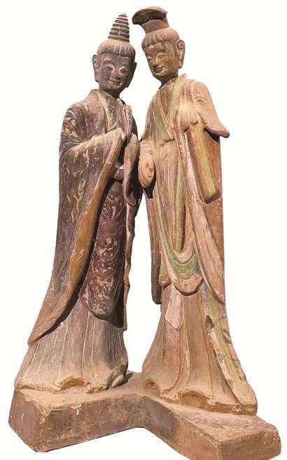 麦积山第121窟正壁龛外的左侧,有一对比肩而立,好似在窃窃私语的造像。这组充满北魏审美风格的作品是麦积山石窟最受人喜爱的雕塑之一。左侧是螺髻梵王,右侧则是一位菩萨。螺髻梵王头束螺旋高发髻,低首下视,眉目细长,双手合十,身穿翻边双领下垂的袈裟,下着长裙,似开似闭的双眼和抿起的嘴唇,露出专心聆听的表情。右侧的菩萨顶束扇形高髻,头微侧,五官清秀,右手握莲,身材修长,细颈削肩,身穿褒衣博带式上衣,下着长裙,足穿云头履。他们紧紧相依,面带笑意,仿佛在互诉心曲。他们到底在聊什么呢?给人们留下了无限的遐想。