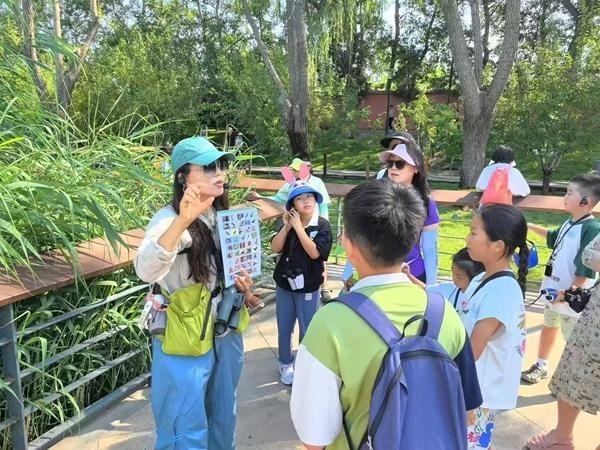 ▲北京红领巾公园,范洪敏(左一)带领观鸟新手小朋友辨识鸟类。(图片来自《中国青年报》)