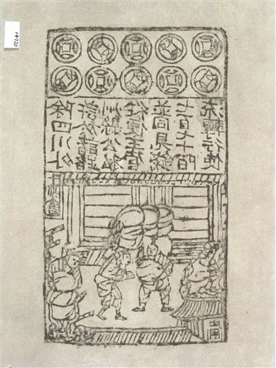 辽宁博物馆藏有一件北宋交子旧版拓存,是由清代研究人员用制作交子的原始印版拓印的,目前我国仅此一件,是国内研究纸币发展史的唯一实物资料。它竖长形的版面分为三个部分,上部有十个方孔圆钱符号,彰显货币属性。中部整齐排列29个字:“除四川外,许于诸路州县公私从便主管,并同见钱七百七十陌流转行使。”大概意思是:“除了四川地区以外,允许在诸路州县,官方和民间的交易均可,经手钱钞者将其视同现钱七百七十陌,流通使用。”短短29个字就规定了流通使用的地区、场合及币值,下部刻有宋代风俗画,这就是当时的“防伪标志”。