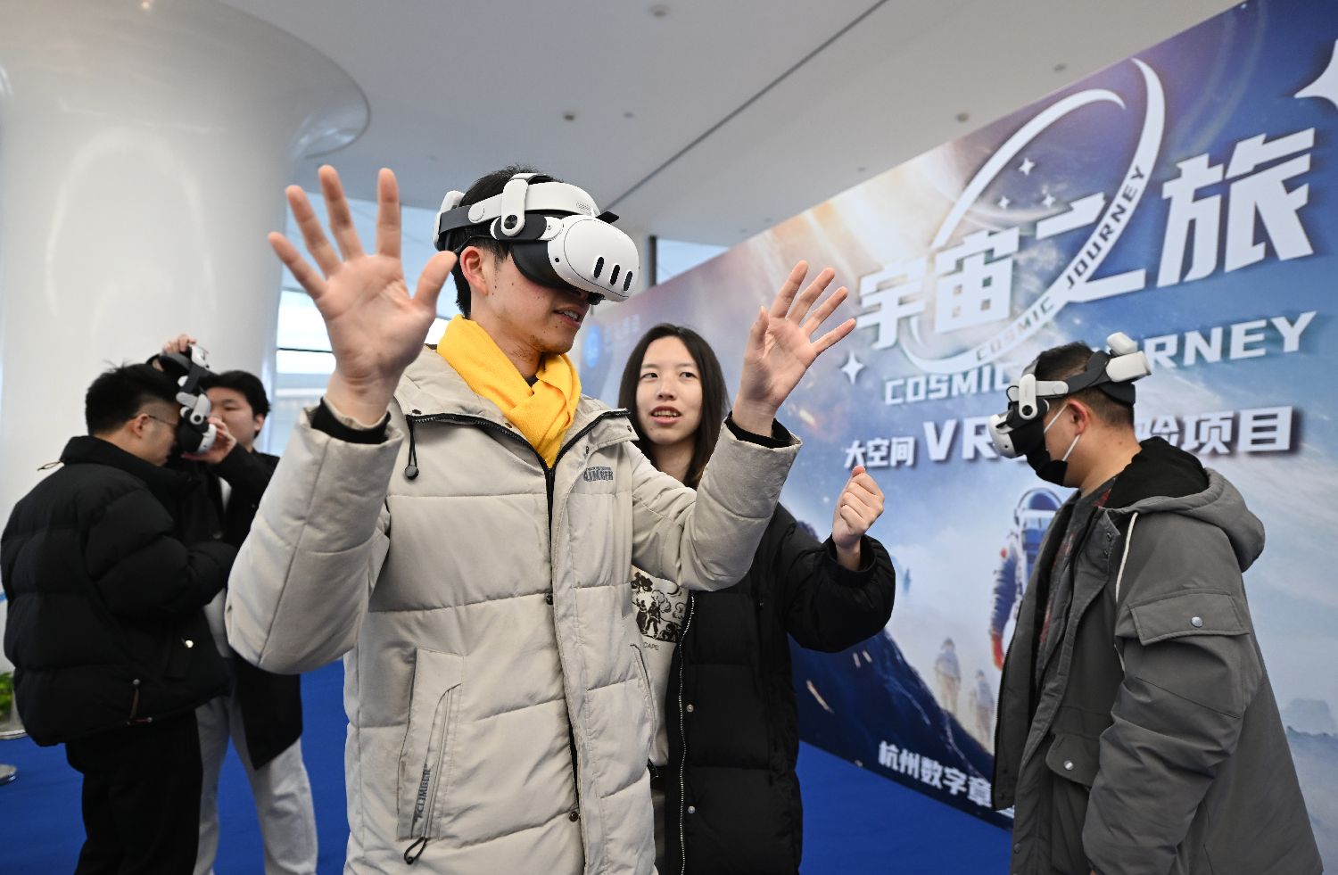 戴上一副“黑框眼镜”,视野中出现了一块可跟随视角实时移动的虚拟屏幕;触摸镜腿处的控制按钮,身旁一台电视机上播放的足球比赛画面顿时出现在屏幕中。在上海近日举行的世界人工智能(AI)大会现场,一家国产智能穿戴设备体验馆吸引了众多观众排队等候,争相体验上述沉浸式场景。一位带着家人前来体验产品的男士对《环球时报》记者说道:“这副智能眼镜让我既能清晰看到赛场画面,又能通过镜腿听到实时声音,这种立体的视听体验让我仿佛置身于绿茵场边。” ▲2月26日,浙江省杭州市西湖区文创大会在当地召开,结合了星际穿越、多人空间联机互动、场景道具交互的《宇宙之旅》VR大空间体验项目吸引与会者。(图片来自中新社)