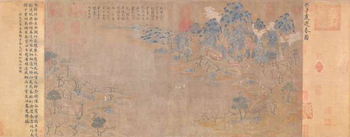 《游春图》后被名家张丑收入,他说“余时时得而校阅之,足称十美具焉”“韩朝延谓此卷为天下画卷第一,信然哉”。