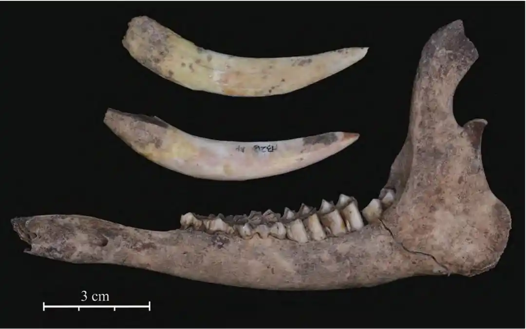 ▲小高遗址出土獐下颌和犬齿(典型标本)。(图片来自《齐鲁晚报》)