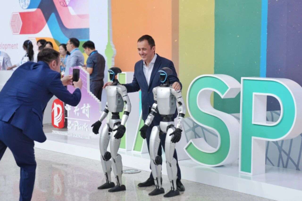 ▲2025年9月17日,国际科技园及创新区域协会(IASP)2025年世界大会在北京国家会议中心开幕。图为外籍嘉宾在大会现场同机器人合影。(图片来自中新社 张祥毅 摄)