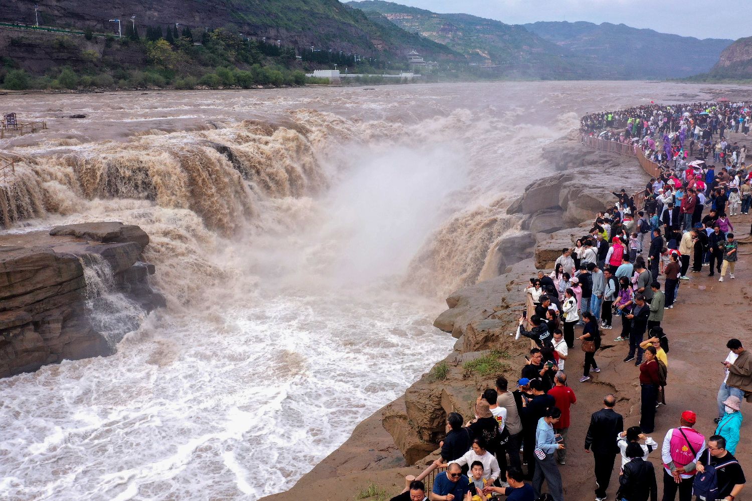 ▲10月3日,大批游客在黄河壶口瀑布景区游览观瀑。(无人机照片)(图片来自中新社)