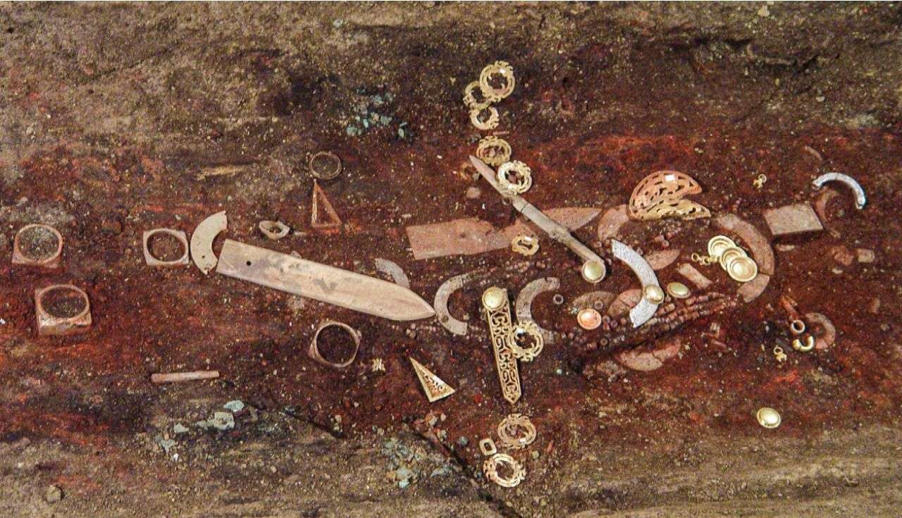 ▲芮公内棺及随葬品,年代为公元前8世纪。他的金腰饰横跨在中间,图的右边有一件玉璜和数排珠饰,左边有一把玉戈。最左边是四件小型玉琮,这证明了人们对玉器的热情,因为数千年来人们大量制作、欣赏这样的玉器,并将其用于随葬。出版方供图