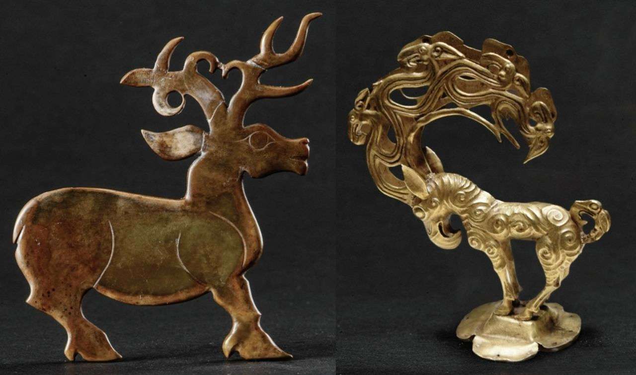 ▲陕西出土的玉鹿(左),类似于草原文化的动物形象,年代为公元前10世纪。陕西神木出土的金鹿(右),带有格里芬的喙和角,边缘饰有猛禽头,年代为公元前4世纪至前3世纪。西伯利亚巴泽雷克墓地出土的木制马笼头饰有同样的角,这表明了跨越草原地带的广泛交流。出版方供图
