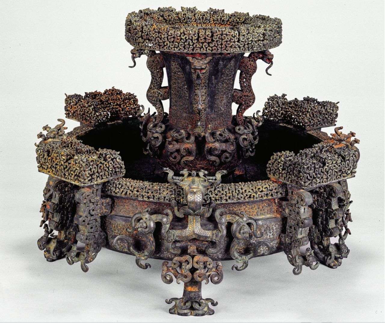 ▲饰有精细繁缛镂空纹饰的曾侯乙尊盘,可谓中国古代最罕见、最特别的青铜礼器之一。出版方供图