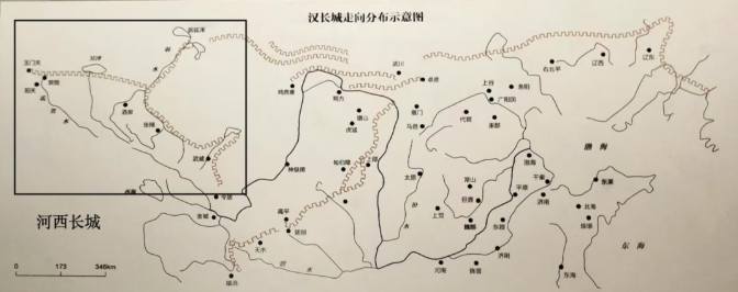 ▲汉长城走向分布示意图,甘肃省简牍博物馆展。(作者摄)