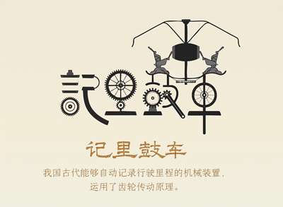 虽然记里鼓车历代相传,但很遗憾迄今尚没有原物存世。幸运的是,《宋史·舆服志》对其原理有详细记载:“足轮各径六尺,围一丈八尺。足轮一周,而行地三步。以古法六尺为步,三百步为里,用较今法五尺为步,三百六十步为里。立轮一,附于左足,径一尺三寸八分,围四尺一寸四分,出齿十八,齿间相去二寸三分。下平轮一,其径四尺一寸四分,围一丈二尺四寸二分,出齿五十四,齿间相去与附立轮同……其中平轮转一周,车行一里,下一层木人击鼓;上平轮转一周,车行十里,上一层木人击镯。”