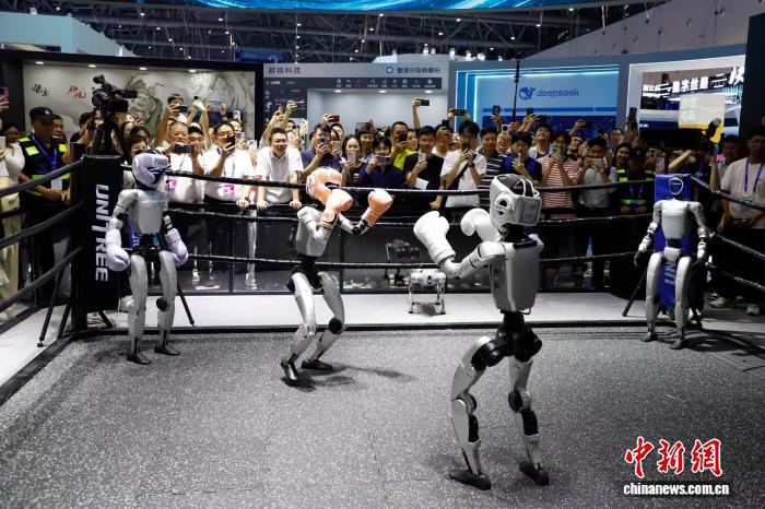 ▲第四届全球数字贸易博览会上,当日,杭州宇树科技股份有限公司举办人形机器人“格斗”表演。李英洁摄(图片来自中新网)