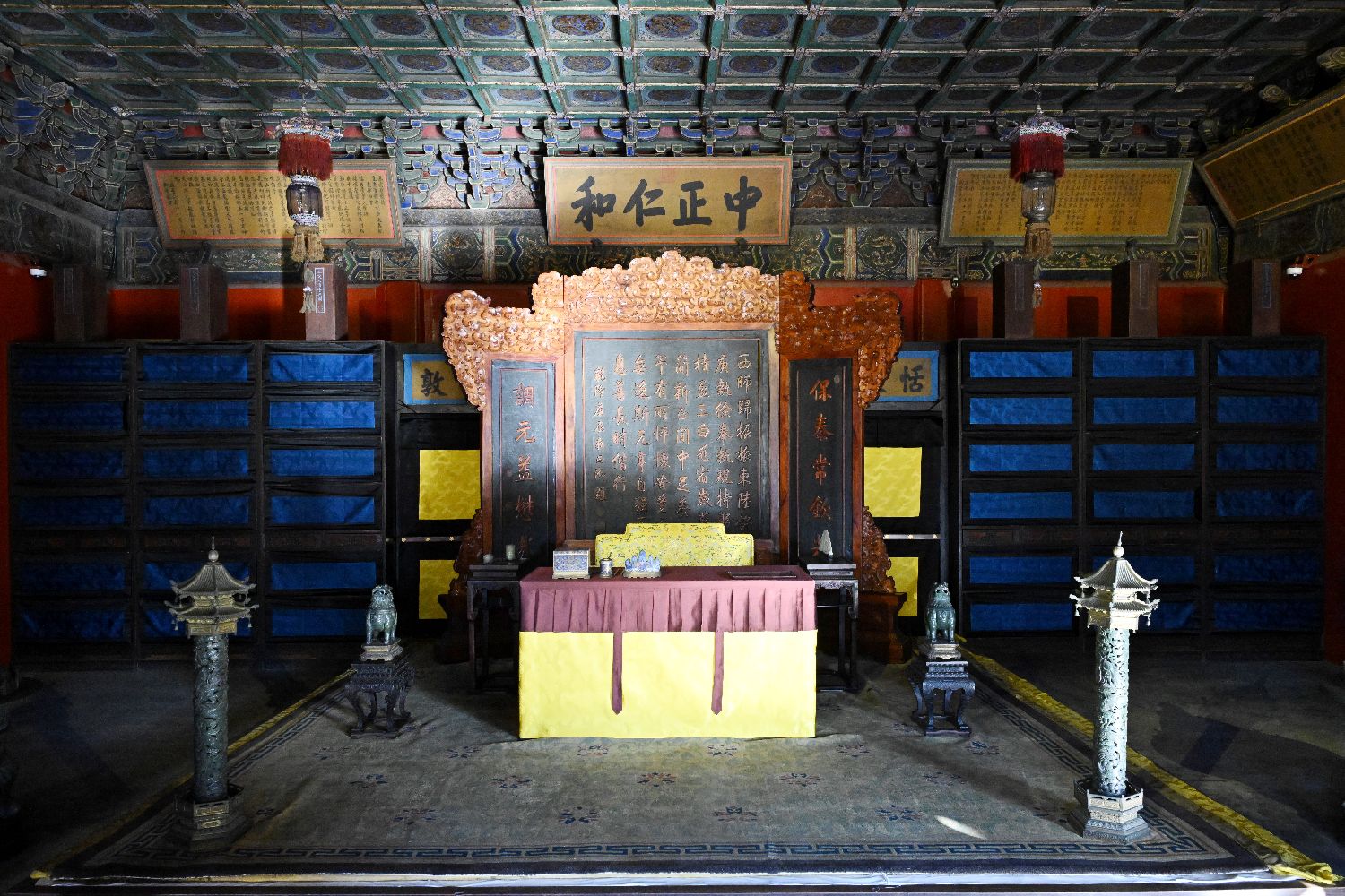 殿门内,雍正御笔“中正仁和”匾高悬。隔窗望,东暖阁屋顶垂落黄色幔帐;三希堂内,御用文房用具巧妙地填满了每寸空间,墙上挂瓶里的宝石花永不凋谢……一切,别来无恙。