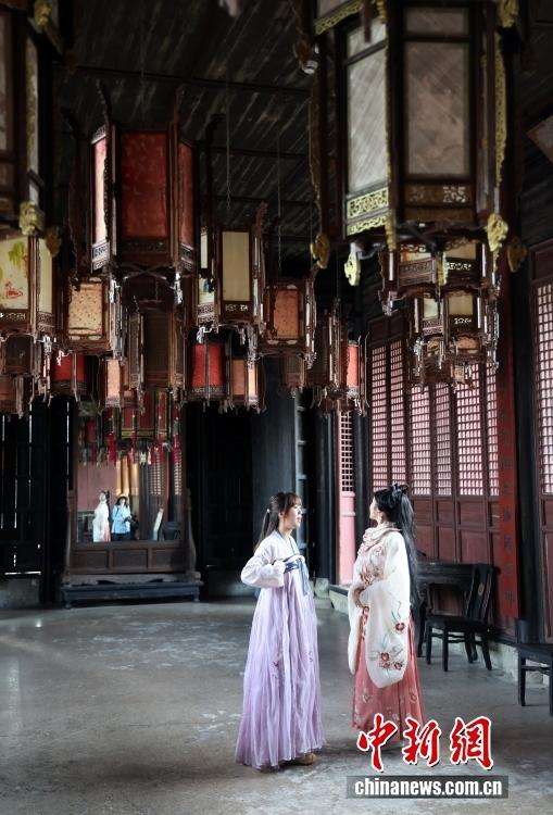 ▲身着古装的游客在卢宅景区肃雍堂参观。中新社发 毛建军 摄