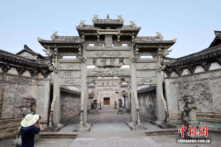 ▲卢宅景区牌坊吸引游客拍照。中新社发 毛建军 摄