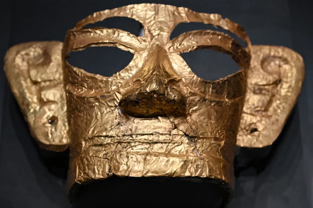 ▲1月18日,“双星耀世——三星堆—金沙遗址古蜀文明展”中展出的金面具(商代)。(图片来自中新社)