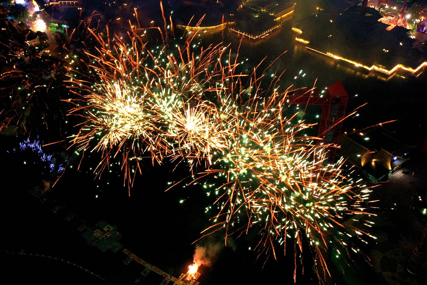 ▲5月10日晚,“星焰焕新·城启璀璨”——中国南昌烟花爆竹产业博览会城市焰火创新展演在南昌融创乐园上演,图为现场的焰火表演。(无人机照片)(图片来自中新社)