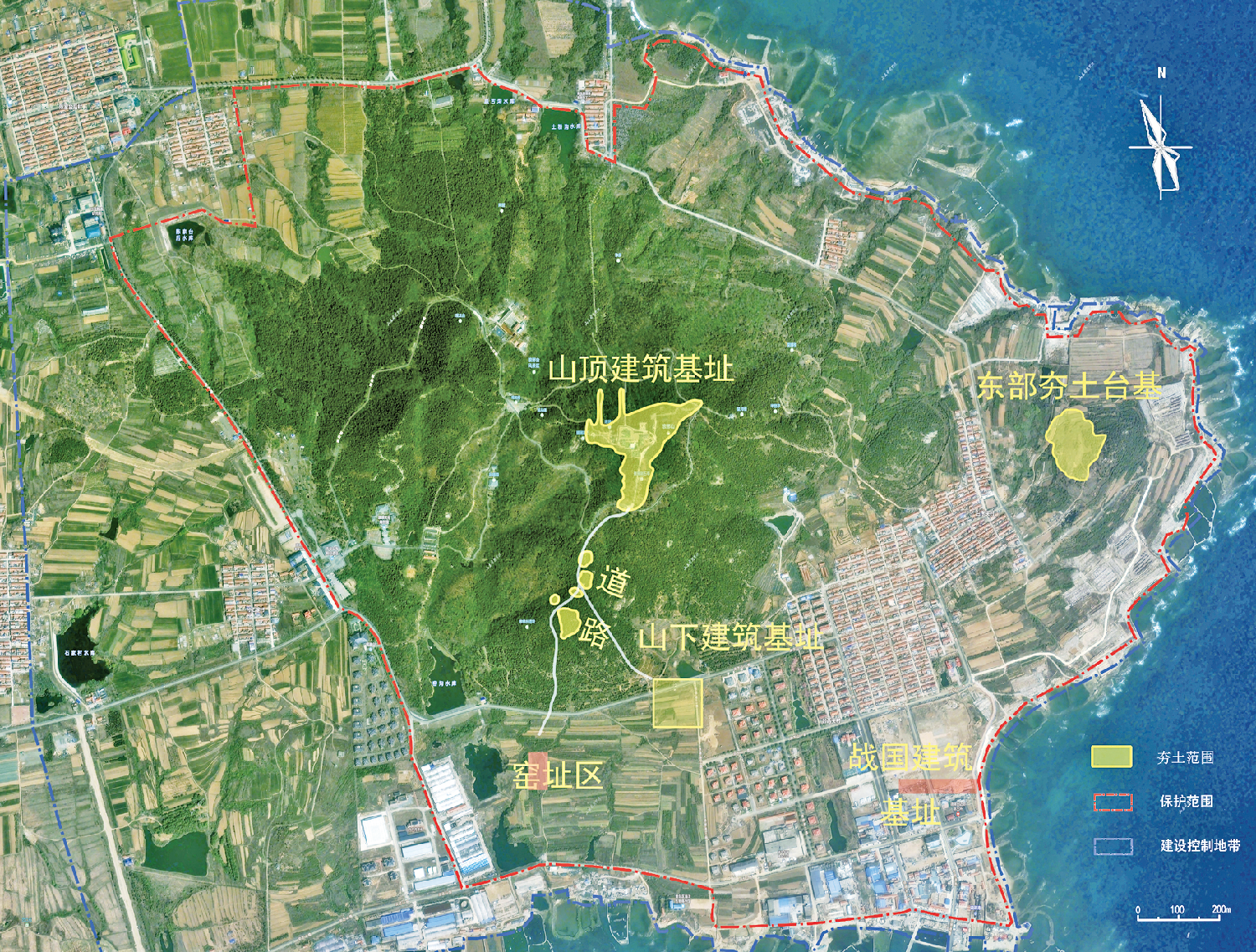 遗址山下正南偏东方向发现一处秦代建筑基址,坐落于背山面海、高亢开阔的山前阶地上,南端距海岸约580米。勘探显示基址平面呈正方形,四面环绕夯土基槽,是一处边长120米左右的方形院落。