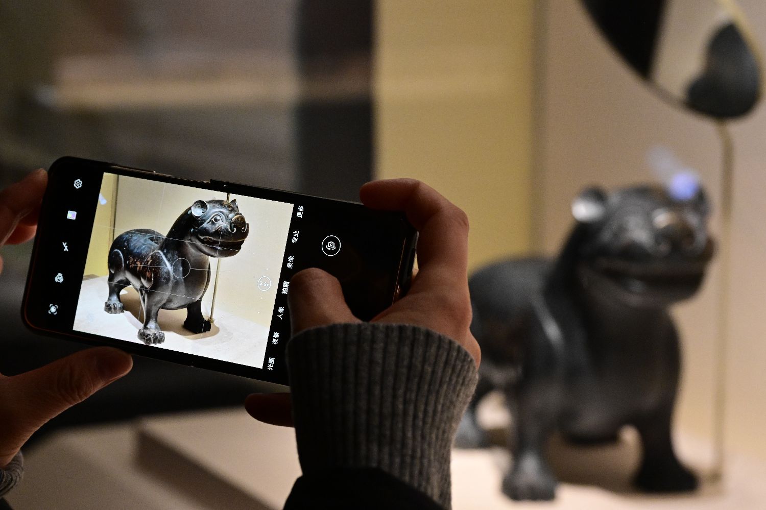 ▲2025年12月26日,参观者拍摄展出的虎形青铜钟虡(战国时期)。当日,“遇见考烈王——安徽淮南武王墩一号墓考古成果展”在北京中国国家博物馆开展。(图片来自中新社)