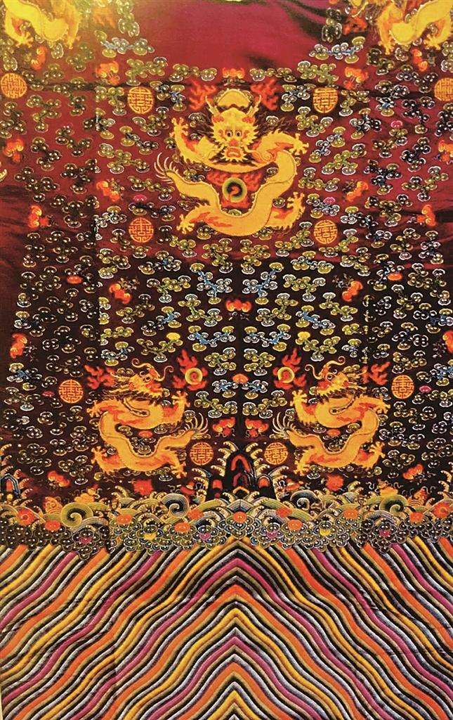 ▲清代藕荷地双面绣瓜瓞锦长衬衣料。(新疆博物馆藏)
