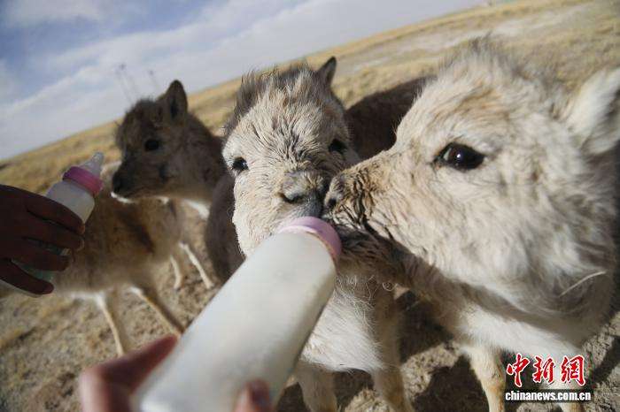 ▲2020年12月16日,在三江源国家公园长江源园区可可西里管理处索南达杰保护站藏羚羊“幼儿园”内,小藏羚羊们正在喝牛奶。中新社记者马铭言 摄