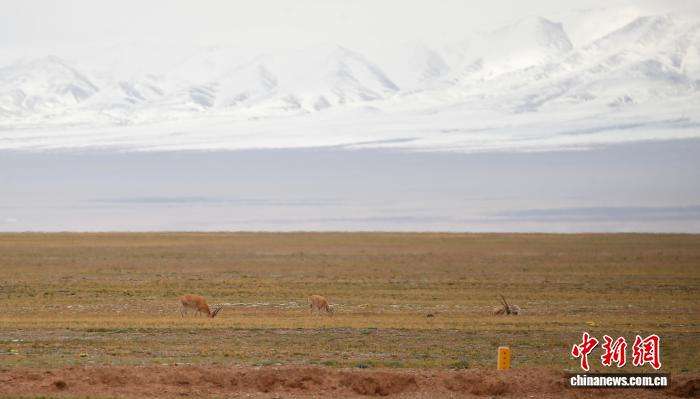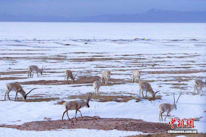 ▲2023年3月25日,成群的藏羚羊在位于青海省玉树藏族自治州的世界自然遗产地可可西里觅食。马铭言 摄