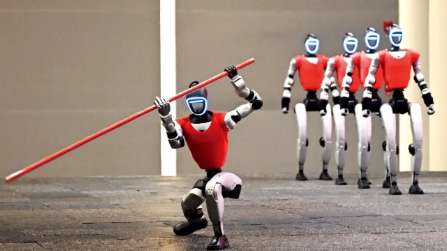 ▲ 2026年2月26日,浙江杭州宇树科技公司内,人形机器人进行武术表演。摄影/本刊记者 王刚