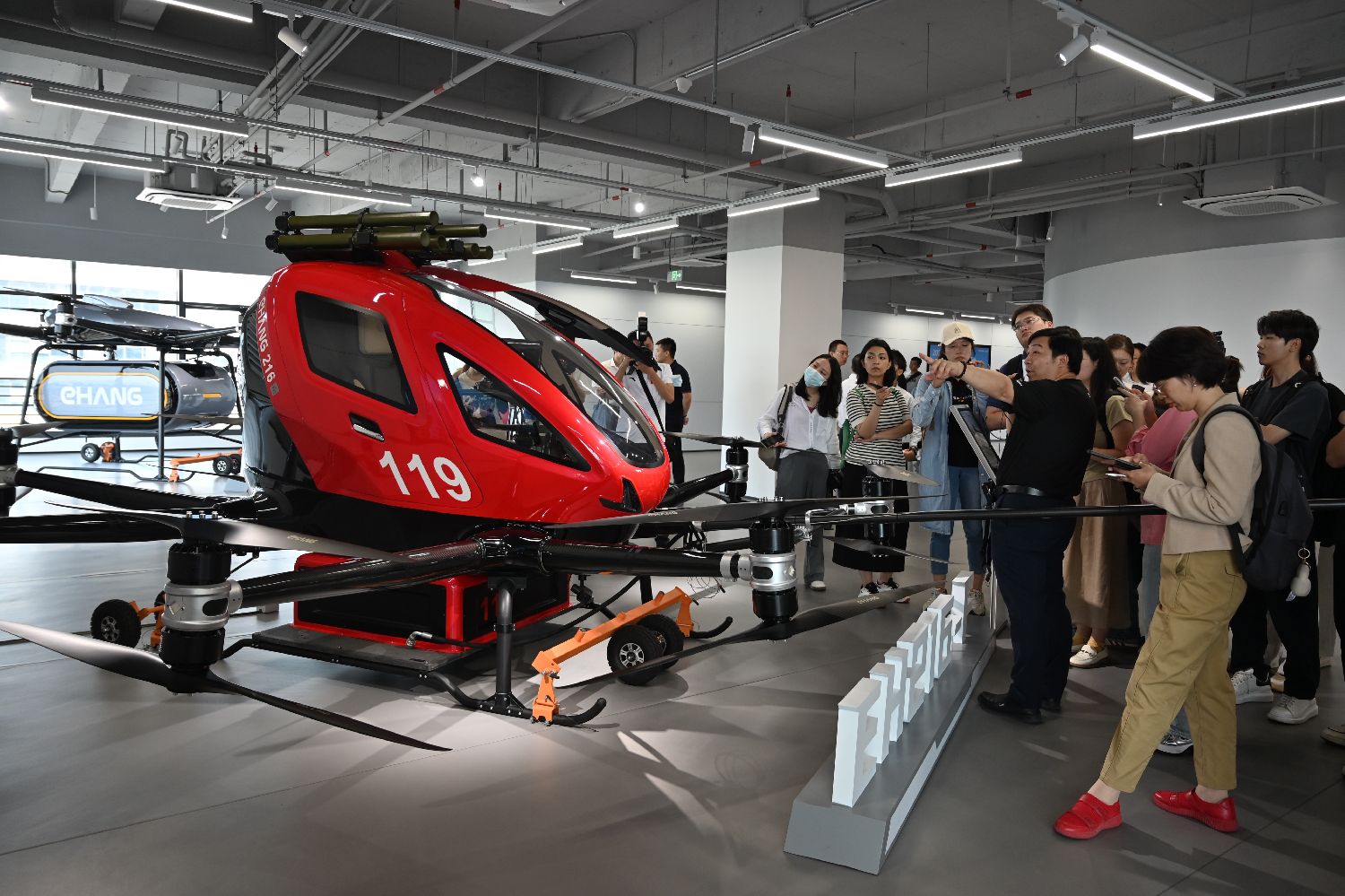 ▲5月14日,广东省广州市,媒体记者在广州亿航智能技术有限公司展厅参观EH216-F。这是全球首个获得适航“三大通行证”的载人无人驾驶eVTOL(电动垂直起降)航空器。(图片来自中新社)