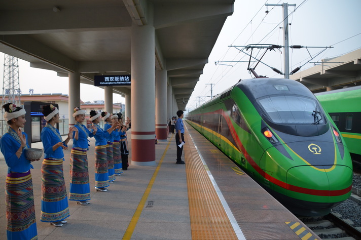 ▲中老铁路西双版纳至琅勃拉邦国际旅客列车驶出西双版纳站。(图片来自中新社)