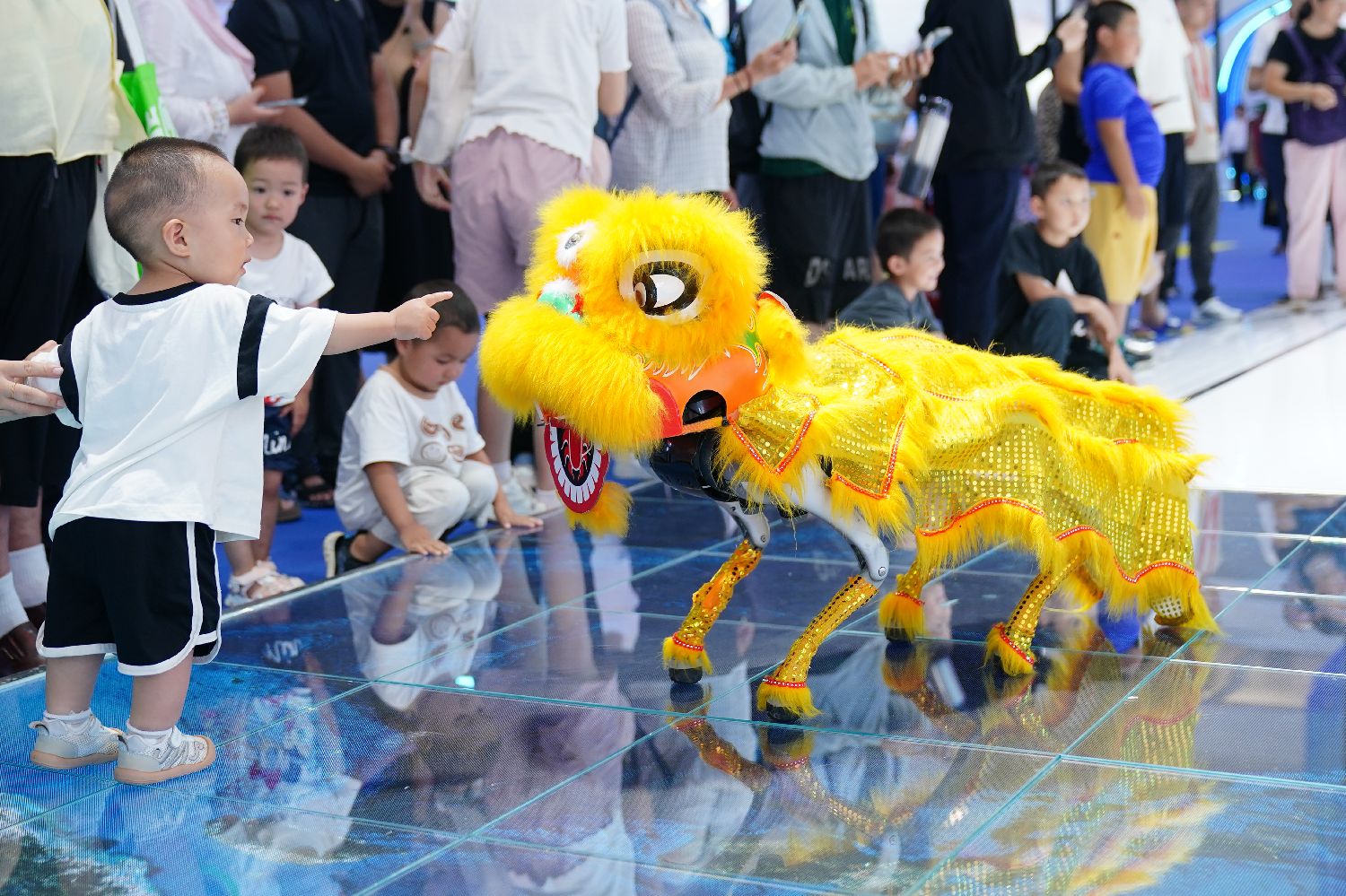 ▲醒狮造型的机器狗吸引小朋友。(图片来自中新社)