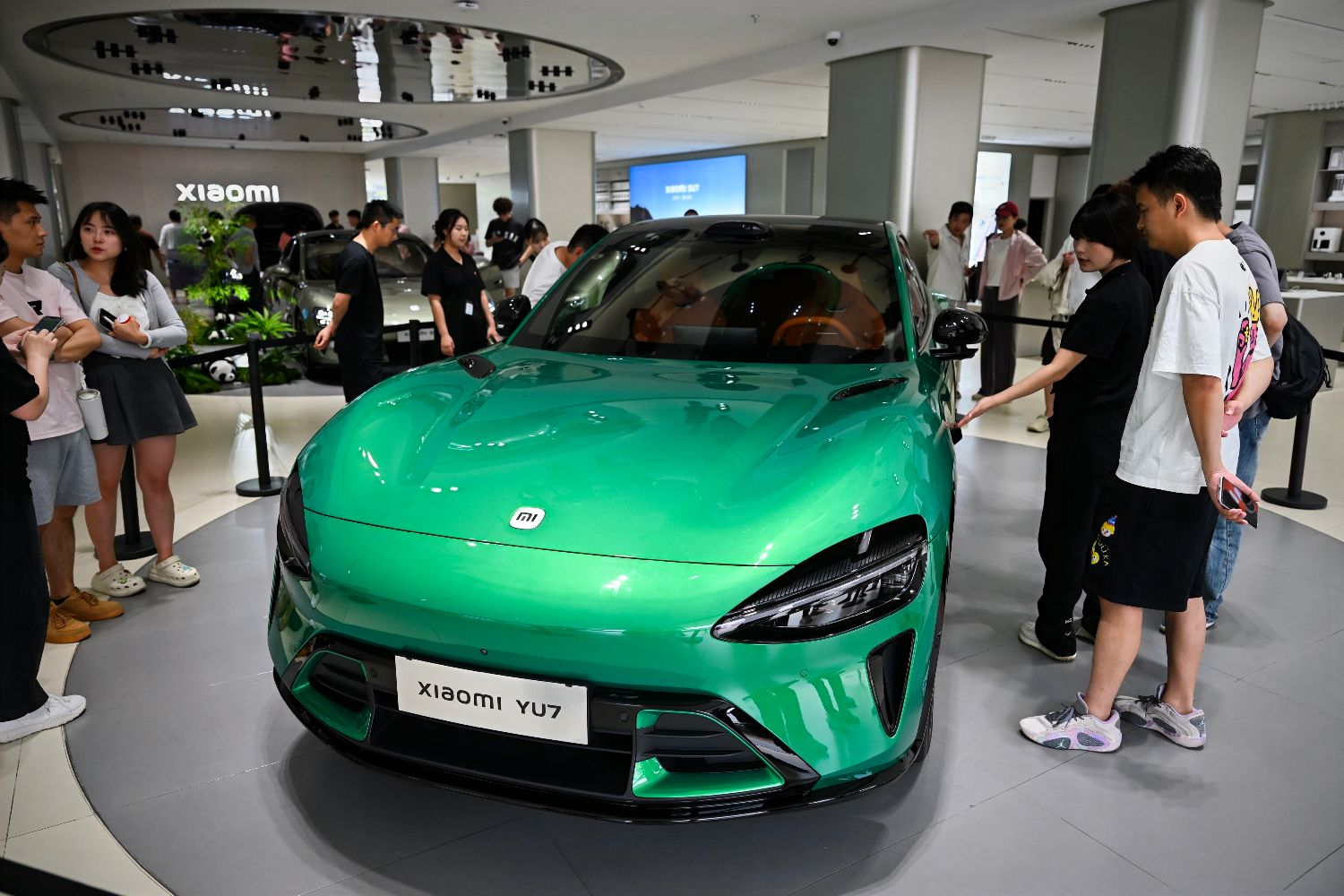 ▲6月2日,四川成都铁像寺小米之家展示的小米YU7吸引民众。当日,成都、杭州等城市的多家小米门店陆续开启了小米汽车首款SUV车型小米YU7的静态品鉴。(图片来自中新社)