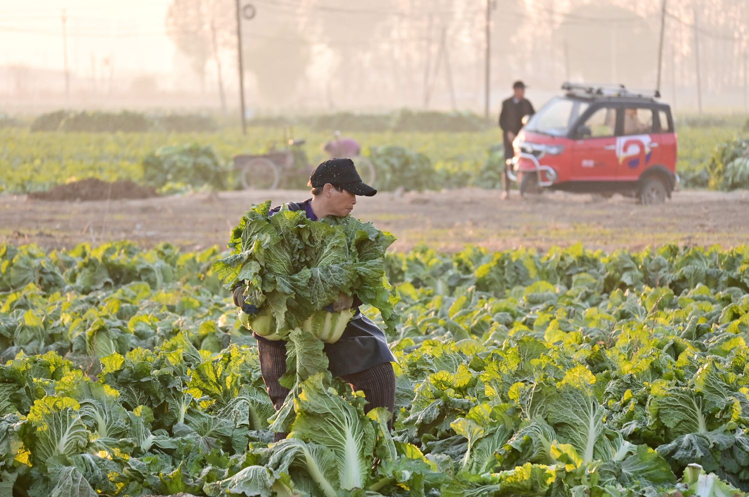 ▲2023年11月14日下午,河北省涿州市刁窝镇东冯村,成片的白菜进入收获期。图为村民收获白菜。(图片来自中新社)