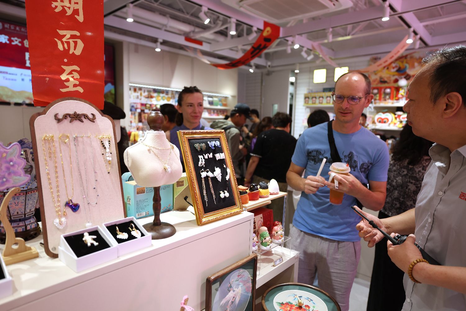 ▲6月17日,国家文化产业创新实验区·国潮文创店上线仪式活动在北京潘家园旧货市场举办,潘家园自营文创店“潘家园礼物”升级为“国家文化产业创新实验区·国潮文创店”首店。图为顾客在店内挑选商品。(图片来自中新社)