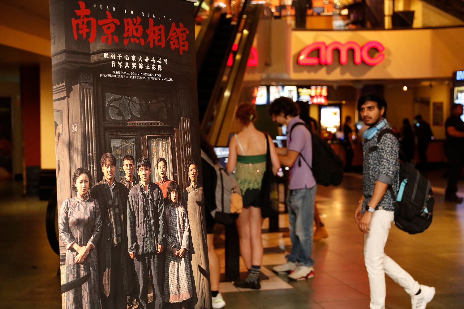 ▲当地时间8月15日,电影《南京照相馆》纽约观影会在时报广场AMC电影院举行,中国驻纽约总领事陈立同近百位纽约各界人士共同观看该影片。图为影院大厅该片海报吸引观众注目。(图片来自中新社)