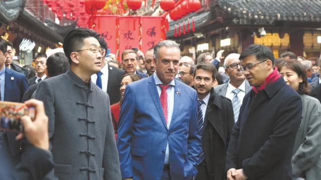 ▲2月5日中午,乌拉圭总统奥尔西在中方人员陪同下,参观游览上海豫园。(图片来自环球网)