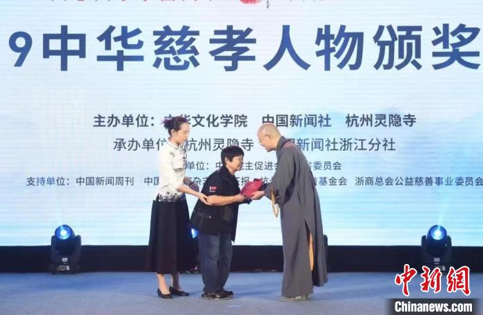▲2019年中国佛教协会副秘书长、杭州灵隐寺方丈光泉法师为陈树菊颁奖。主办方提供