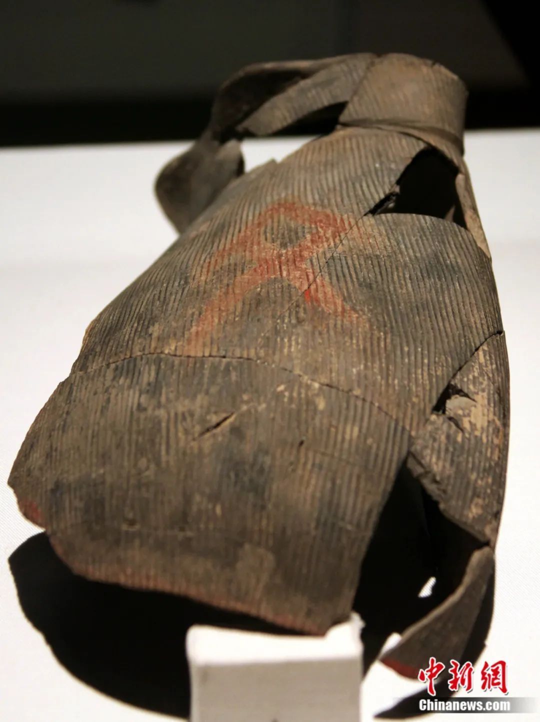 ▲山西省襄汾县陶寺遗址出土的4000年前毛笔朱书文字“文”,其年代早于甲骨文。孙自法 摄